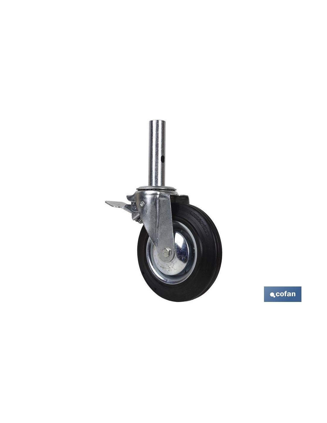 Rueda de andamio giratoria tubo macho con freno. Las medidas son: 200 mm de diámetro de rueda x 46 mm de grosor de rueda x 35 mm de diámetro tubo macho. Rueda especial para andamios con sistema de freno. Se utilizar para mover andamios de construcción. Rueda es de goma y el entramado de acero metalizado. Peso máximo 250 kg. Resistente al desgaste y con posibilidad de fijación de freno.