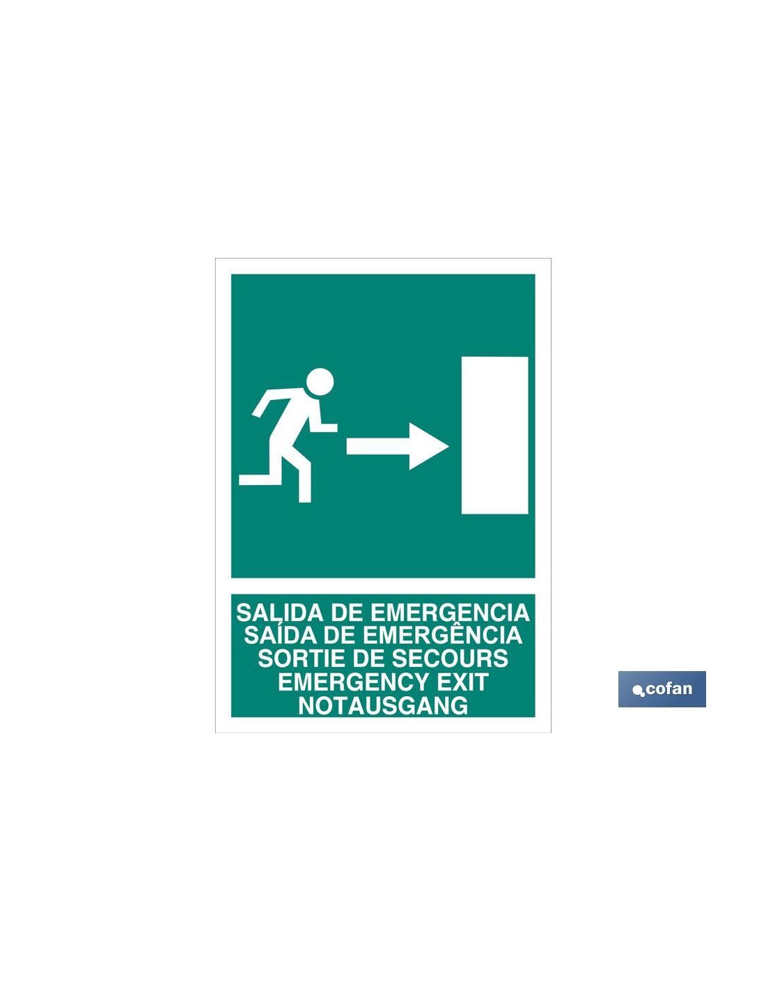 Señal texto y pictograma salida de emergenciaderecha luminiscente en varias medidas. El diseño de la señal puede variar, pero en ningún caso se variará el significado de la misma.