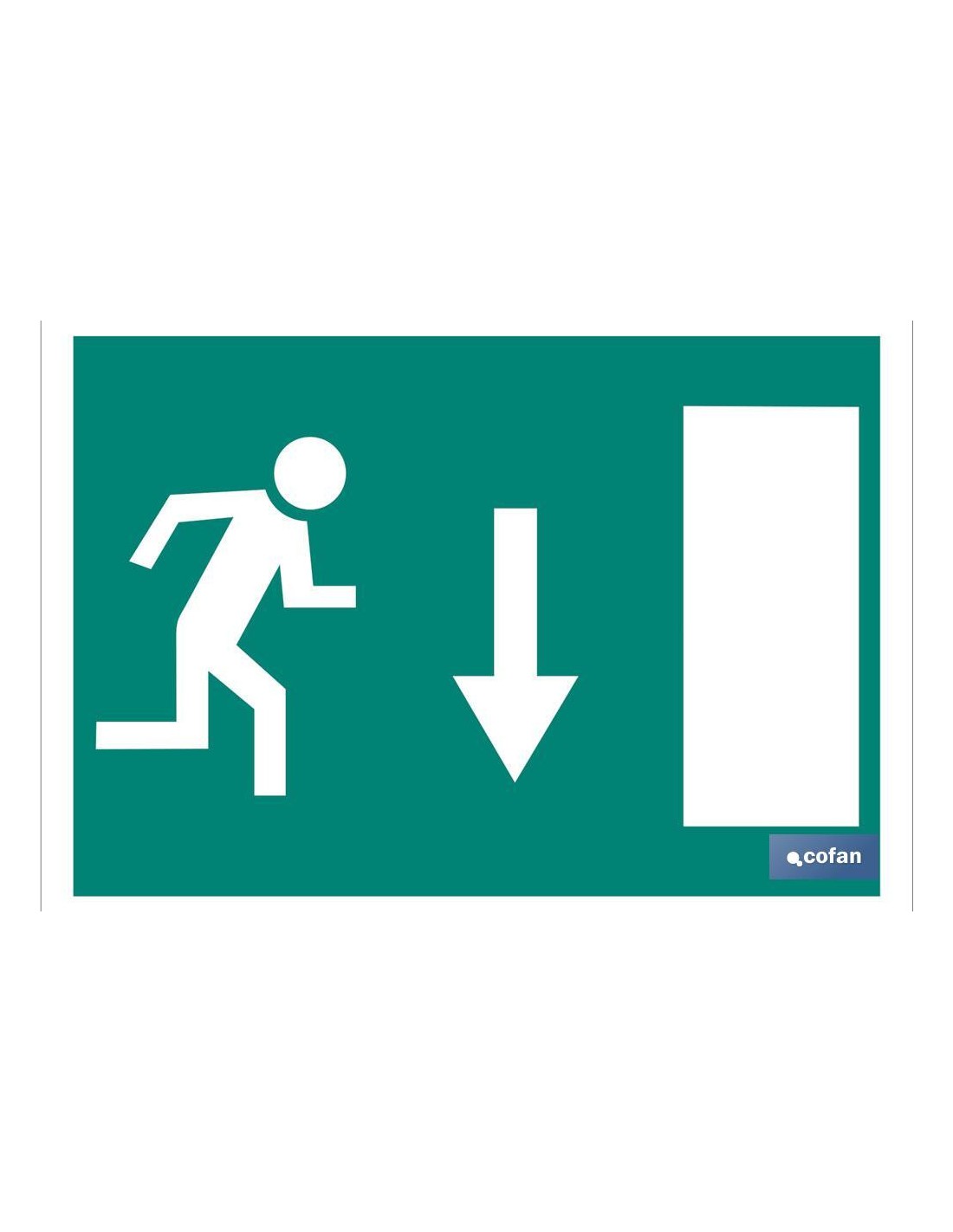 Señal salida de emergencia luminiscente hacia abajo en varias medidas. El diseño de la señal puede variar, pero en ningún caso se variará el significado de la misma.