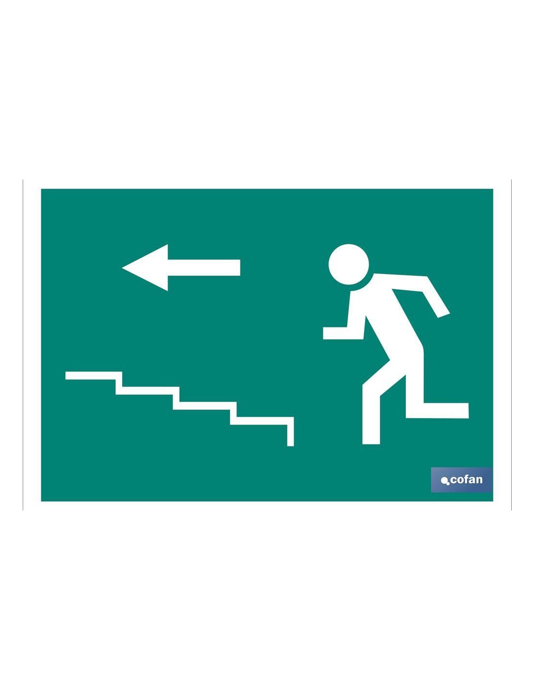 Señal salida subida escalera luminiscente con flecha a la izquierda. El diseño de la señal puede variar, pero en ningún caso se variará el significado de la misma.