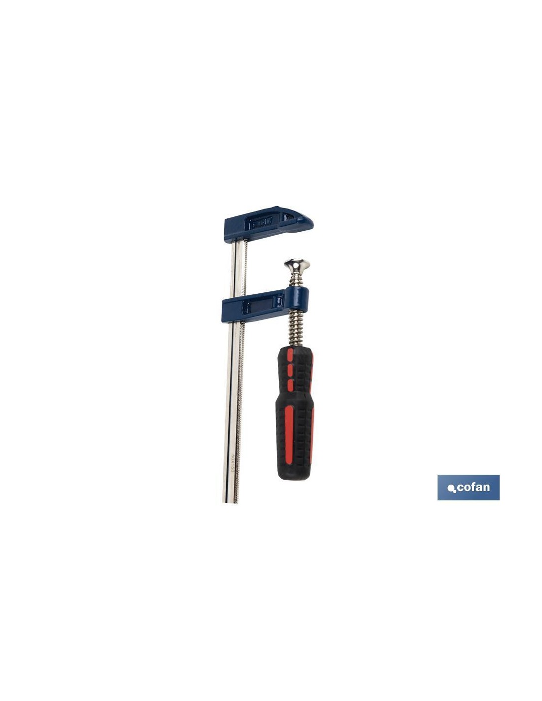Sargento de sujeción modelo F. Está fabricado en hierro fundido de muy buena calidad. Sus aperturas van desde 150 hasta 400 mm y de anchura desde 50 hasta 120 mm. Su mango ergonómico le ahorra fuerza a la mano a la vez que le proporciona un excelente agarre. La parte de hierro con mango se puede ajustar fácilmente mediante una barra deslizante, para materiales con diferentes anchos. Puede soportar un trabajo intensivo, duro y duradero. Es ideal para trabajar con madera o hierro.