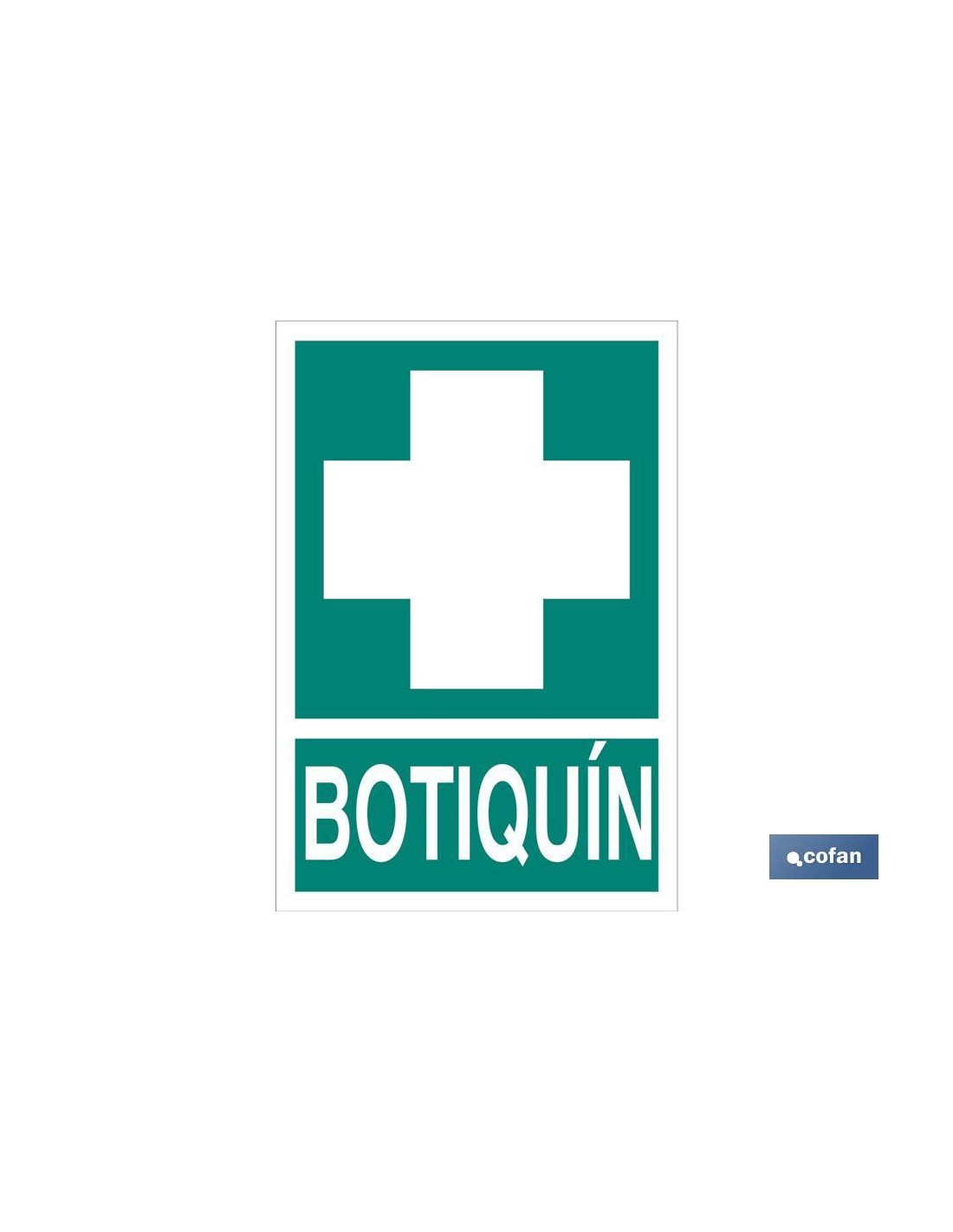 Señal de evacuación Botiquín. Tamaño y material a elegir (luminiscente y adhesivo). El diseño de la señal puede variar, pero en ningún caso se variará el significado de la misma.