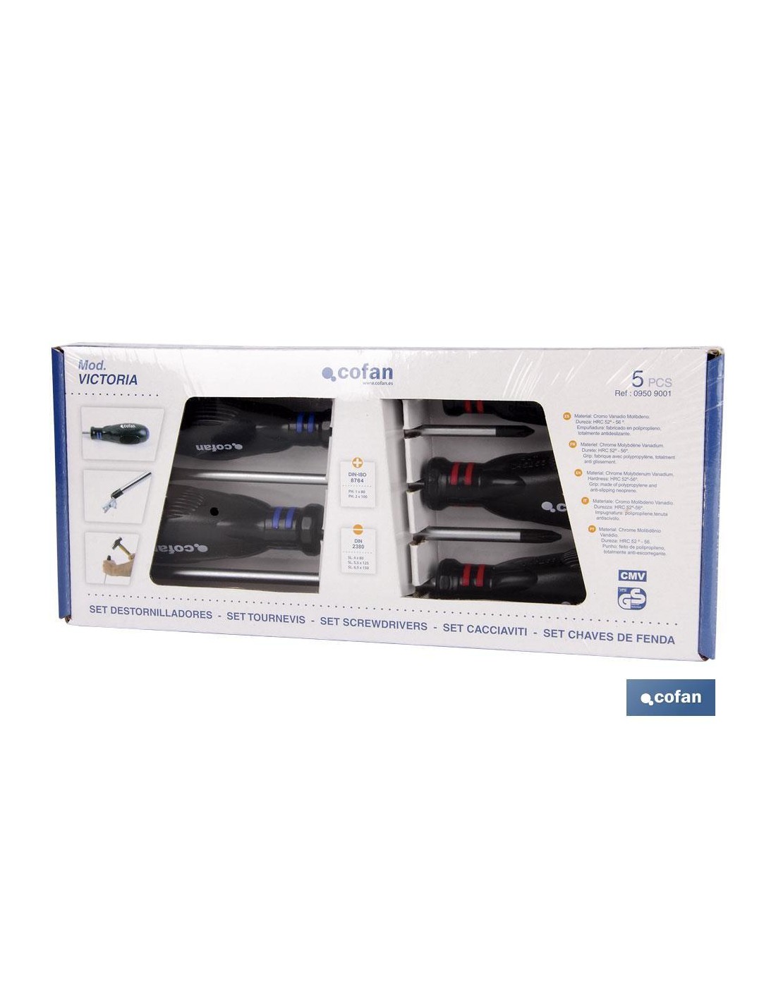 Juegos o sets de destornilladores Modelo Victoria. Cuentan con 5 y 7 unidades de destornilladores planos, Phillips y torx. Se presentan en una elegante caja de cartón expositora. Destornilladores de alta calidad y mango ergonómico de goma que facilita su uso y gran durabilidad.