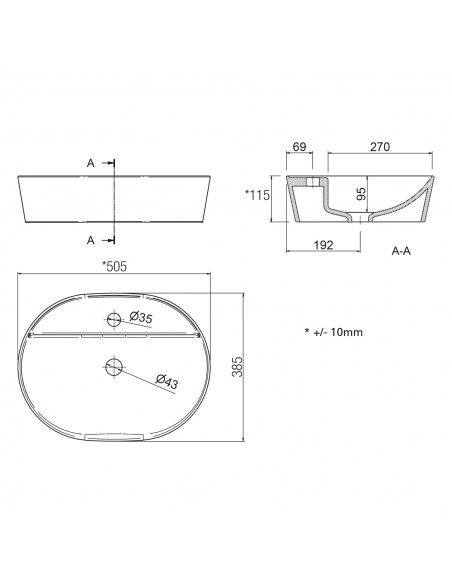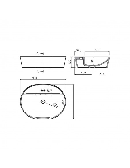 Este lavabo está disponible en 500mm x 385mm y 120mm de altura.
