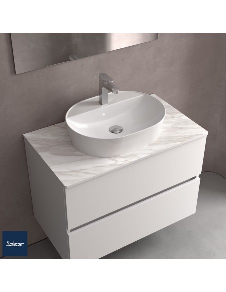 Este lavabo de posar de porcelana blanca se caracteriza por su forma ovalada que le convierten en un elemento distintivo, dándole un toque de amplitud y carácter a tu baño.