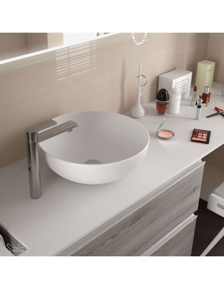 Este lavabo de posar de porcelana blanca se caracteriza por su acabado en mate y reúne características que hacen de tu lavabo un elemento distintivo de tu baño. Entre ellas destaca su diseño, ya que cuenta con unas líneas finas y dispone de una forma circular cuyo diámetro es de 390mm y 140mm de altura.