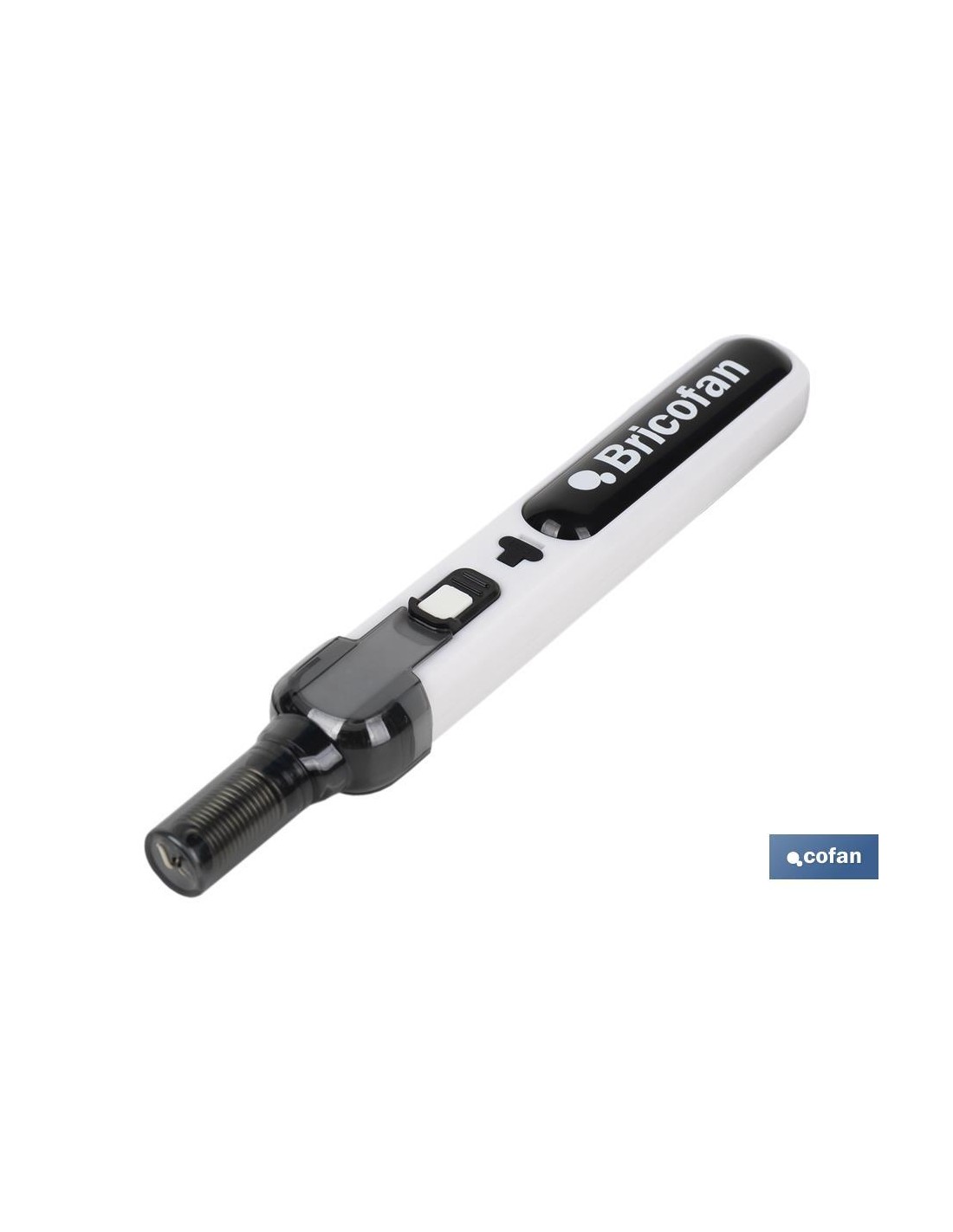 Soldador eléctrico con batería de 3,6 voltios y 2,0 Ah. Este soldador se calienta muy rápido, por lo que solo tienes que esperar 5 segundos para que la herramienta alcance 450 °C. Cuenta con una tapa protectora que únicamente puede colocarse cuando el dispositivo se encuentra apagado. Además, tiene un sistema de apagado automático que se activa al soltar el botón de soldar. Ideal para llevar a cabo pequeños trabajos donde priman la ergonomía, la rapidez y la precisión. La herramienta se suministra en un set que incluye el soldador eléctrico, hilo de estaño para soldar de 1 milímetro, una esponja de limpieza y un cable USB de tipo C. El dispositivo solo pesa 78 g y cuenta con unas medidas de 180 x 24 x 22 mm.