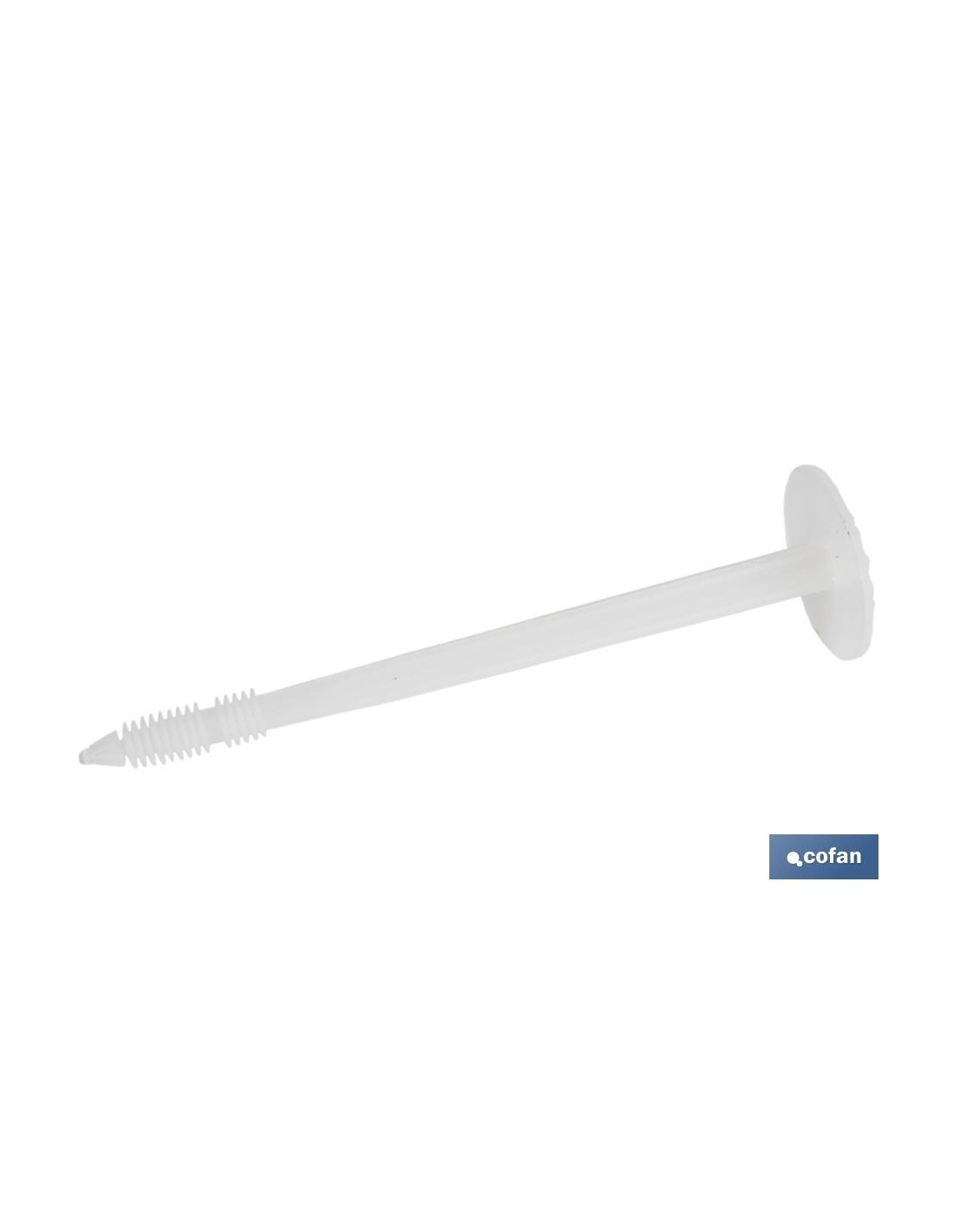 Taco de fijación de paneles aislantes sin clavo y de expansión.Fabricado en polipropileno monocomponente. Estos tacos se utilizan para la fijación de sistemas de aislamiento térmico por el exterior. Se consigue una fijación rápida, con montaje a través del aislante a fijar, instalándose por golpe sobre el taco de nylon y posteriormente el clavo. Es apto para una gran variedad de materiales base: hormigón, piedra, ladrillo macizo, ladrillo hueco, bloque hueco, etc.Válido para fijación de paneles de aislamiento térmico por el exterior de diferente naturaleza: lanas minerales, poliestirenos, lana de vidrio, lana de roca, corcho, paneles de celulosa, etc. Homologación europea, ETA-21/0823, para uso en hormigón, hormigón aireado, ladrillos silicocalcáreos, ladrillos de arcillas y bloques de hormigón. Medidas de longitudes desde 80 mm hasta 140 mm y diámetro de Ø8 mm. Pack de 100 unidades.