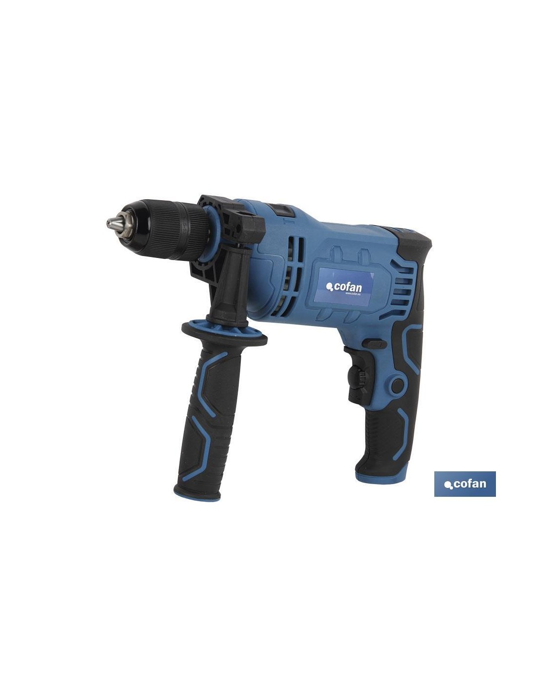 Taladro de impacto 910 W con portabrocas de seguridad automático para brocas de 1-13 mm. Potencia de salida: 0-2800 rpm., 8,6 Nm de par, portabrocas sin llave (automático), 1-13mm, selector de velocidad en gatillo, empuñadura lateral multiposición, peso 2,7 kg. Nº REI-RAEE de Cofan La Mancha: 7038.