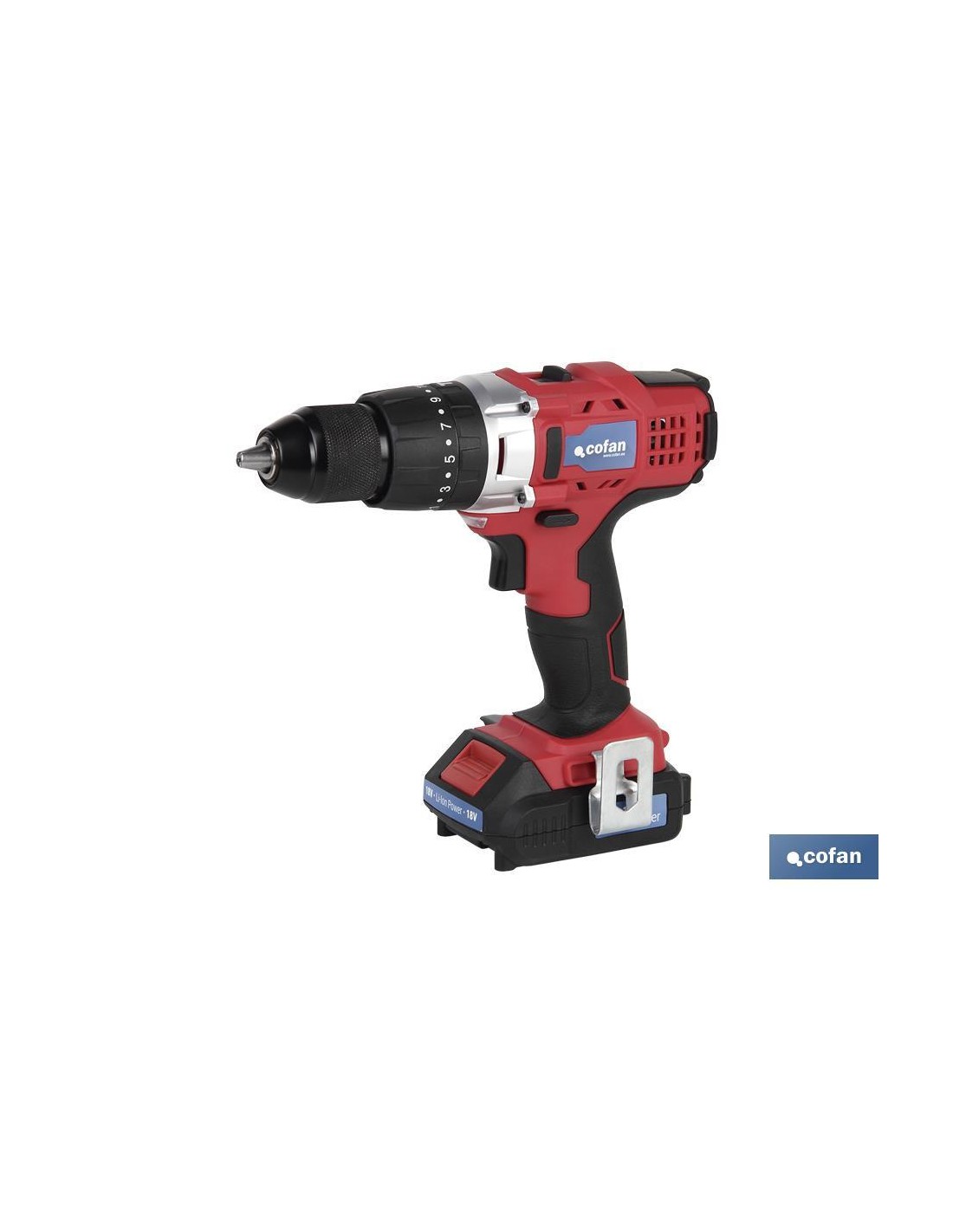 Taladro Percutor y atornillador de 2 velocidades, con 16 posiciones de apriete, control variable de velocidad y selector de giro izq./dcha. Con luz de trabajo Led y clip de metal para ajuste en cinturón. Incluye maletín con 13 piezas y un cargador de batería. Nº RII-AEE de Cofan La Mancha: 7038