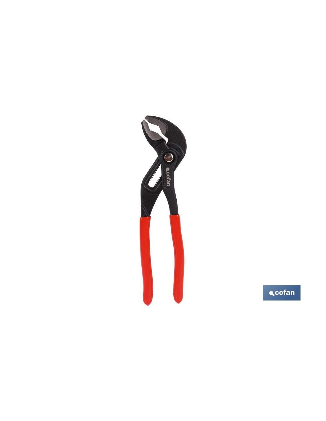 Tenaza de canal con botón de auto ajuste rápido auto grip. Con varias medidas de longitud en 7, 10 y 12 pulgadas. Tenaza fabricada en acero y mango de PVC color rojo para un agarre más cómodo.