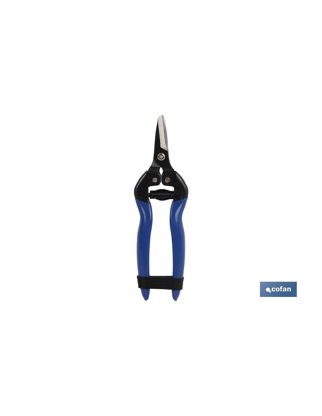 Tijeras de recolección con punta curva de 185 mm. Su hoja es de acero, el mango está bañado en PVC antideslizante y están equipadas con un sistema de cierre de seguridad. Este producto es especial para la recolección. Esta herramienta es perfecta para trabajos de acondicionamiento y limpieza en jardinería, agricultura y horticultura. Su filo afilado está totalmente capacitado para realizar tareas de carácter profesional. Su mango es cómodo y no permite el deslizamiento. Su sistema de seguridad ayuda a que las hojas se mantengan afiladas cuando las tijeras no están siendo usadas y evita cortes o lesiones por accidente.
