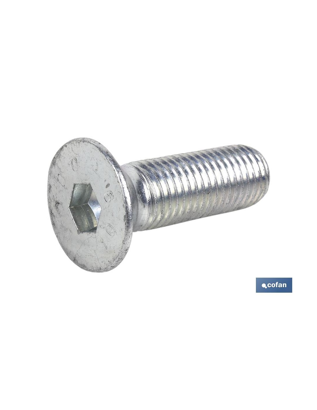 Tornillo allen DIN 7991 cabeza avellanada y plana, con hexágono interior , clase 10.9, acabado ZINCADO. Medidas desde M-3 hasta M-20