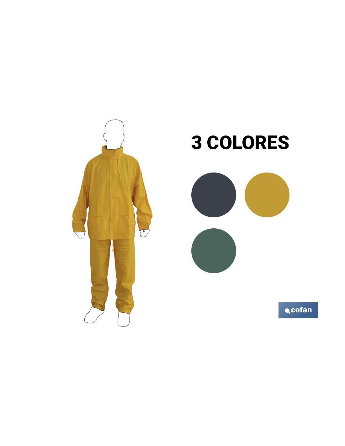 Traje de agua compuesto por chaqueta y pantalón, es muy ligero, resistente y flexible con capucha oculta en el cuello. Ventilación interior y puños elásticos interiores. Cuenta con dos bolsillos con tapa para que no entre el agua. El cierre de la chaqueta es con corchetes aportando comodidad. Disponibles en tallas desde la S hasta la XXXL y en colores como Amarillo, Verde y Azul Marino.