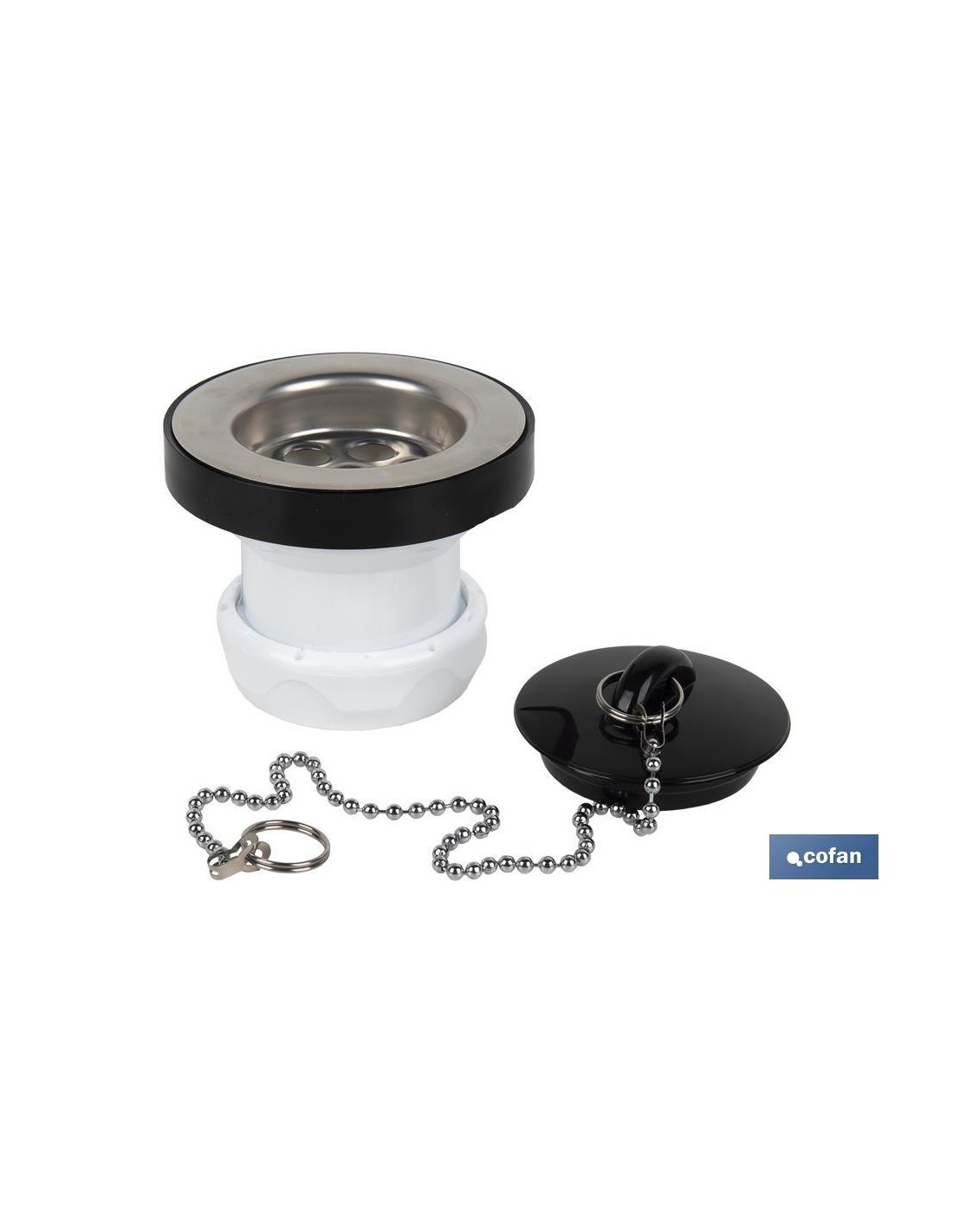 Válvula para lavabo-bidé fabricada en polipropileno de alta calidad. Alta capacidad de desagüe. Incluye tapón fabricado en PVC de alta calidad, tornillo para su perfecta instalación y cadena con dos anillas de longitud 250 mm para ajustar al grifo.
