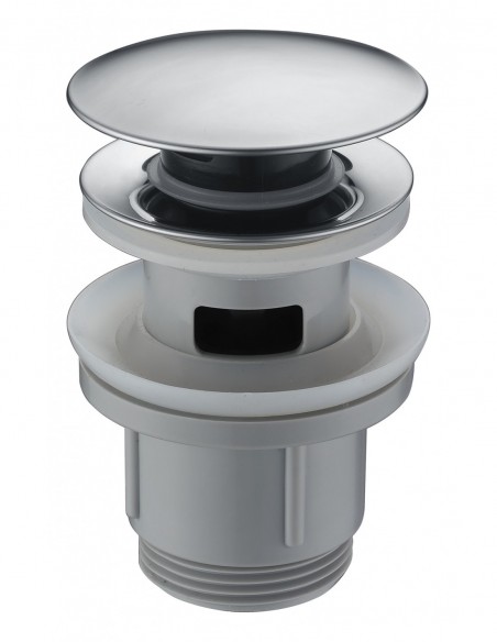 Válvula click-clack cromada, apta para todos los lavabos y bidés con o sin rebosadero, sistema de apertura/cierre garantizado para ciclos de 20.000 usos, rosca inferior de 1 1/4", fabricadas en PVC con tapa acero s.304 cromada. Montaje rápido y sencillo.