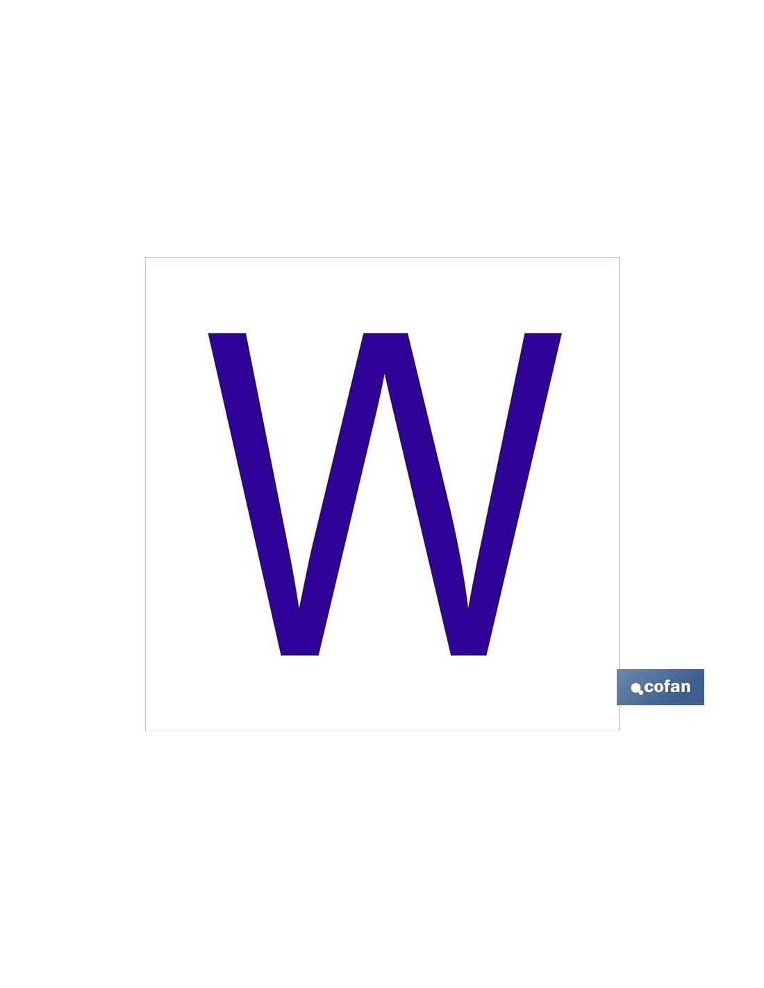 W Letra en glasspack adhesivo con el fondo blanco y carácter azul con medida en 62 x 62mm. El diseño de la señal puede variar, pero en ningún caso se variará el significado de la misma.